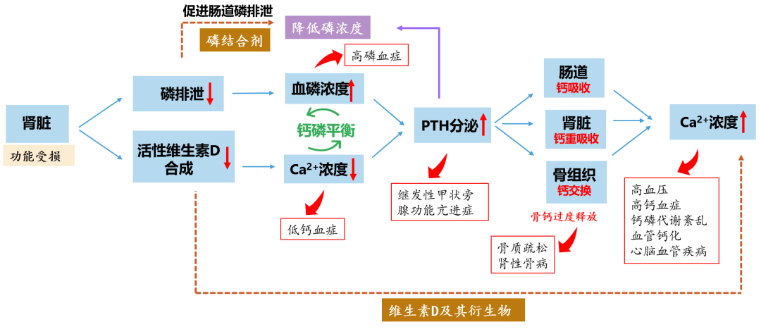 當腎臟受損,合成活性維生素D受阻,為維持鈣磷平衡,甲狀旁腺會分泌更多甲狀旁腺激素。甲狀旁腺激素通過增加骨組織鈣的釋放、腎內鈣的重吸收和磷的排泄,促進血鈣濃度升高、血磷濃度降低。長期過度刺激甲狀旁腺會引起這種代償調節逐漸失效,導致鈣、磷、甲狀旁腺激素水平失控,形成惡性循環。[1-2]