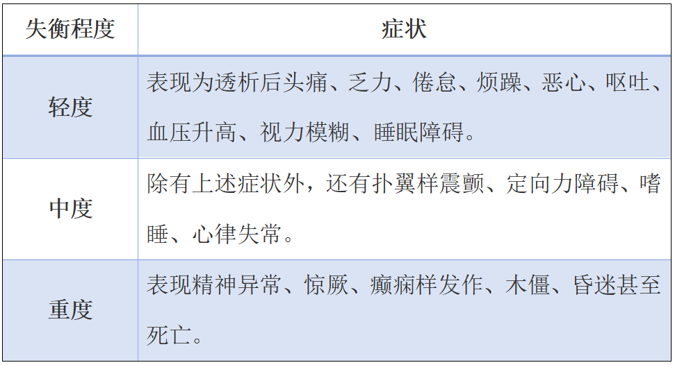 不同程度的透析“失衡綜合征”癥狀表現如下: